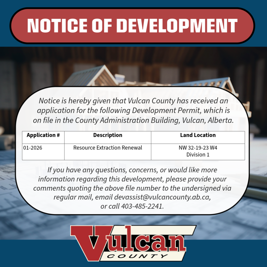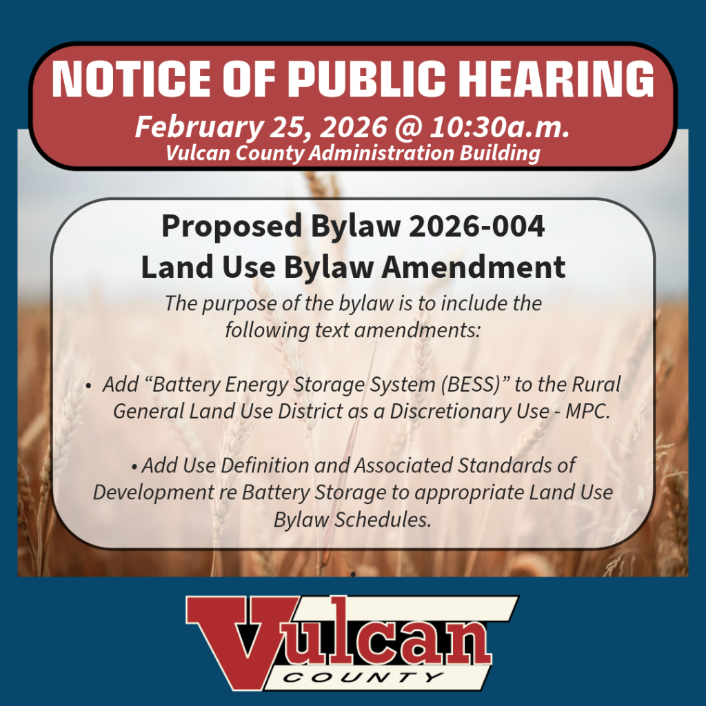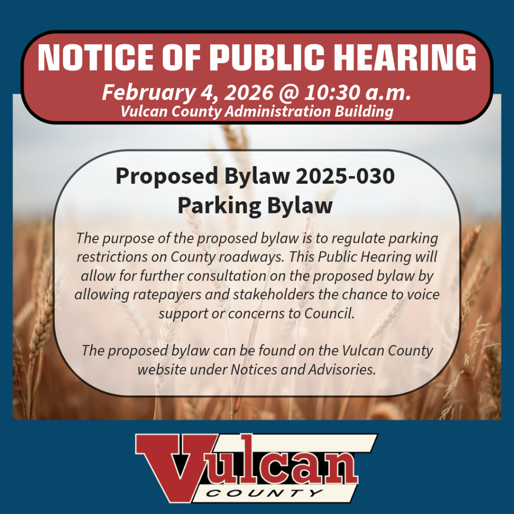 To participate the public is welcome to attend the Public Hearing in person or virtually. To participate virtually, please contact our CAO no later than 4:00p.m. on February 3rd via email cao@vulcancounty.ab.ca or call (403)485-2241.