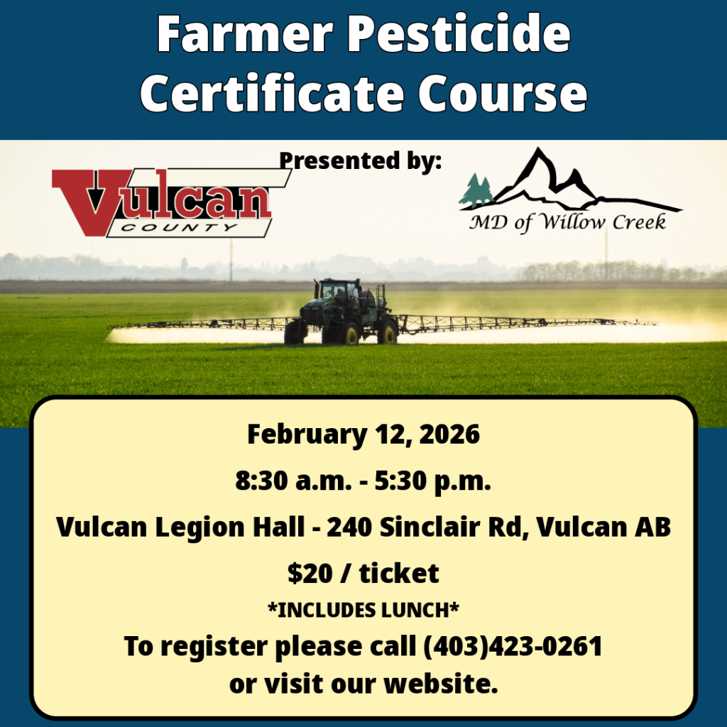 Farmers who wish to use restricted pesticides are required to have a Farmer Pesticide Certificate. Vulcan County is now offering this certification as of February 2024.