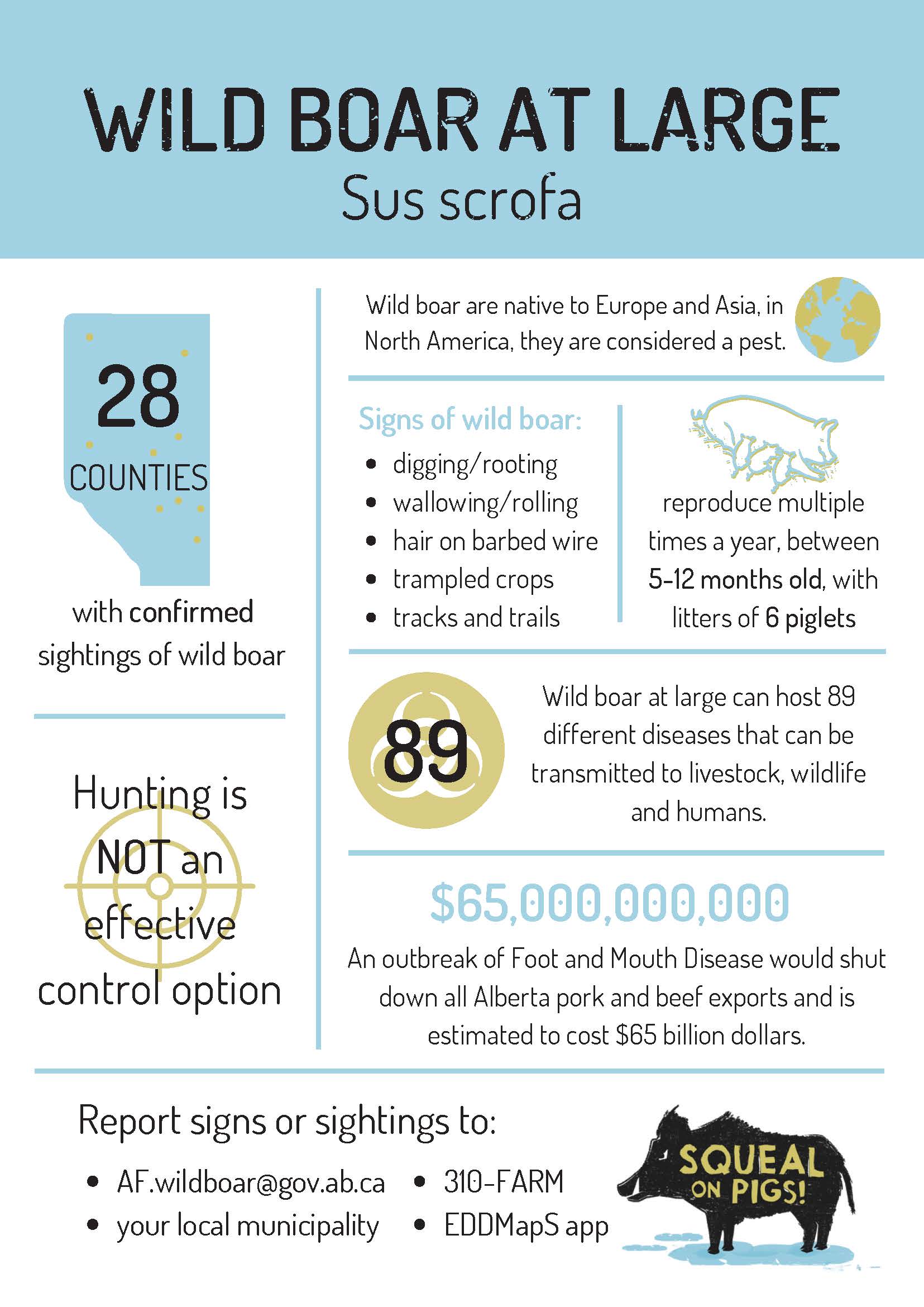 Wild boar are an invasive species and a provincially regulated agricultural pest in Alberta as they can damage property, crops, pastures and the environment. They are also known to endanger people and animals.
